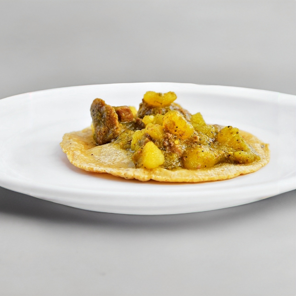 Medio litro de cubitos de puerco y papas en salsa de chile pasilla. Incluye tortillas artesanales.