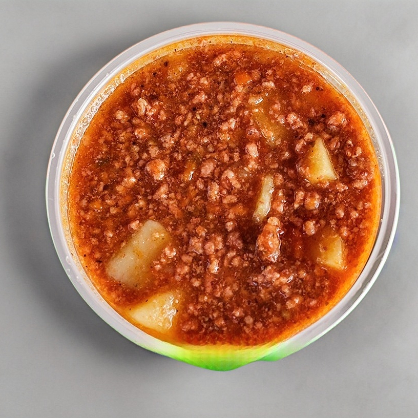 Medio litro de picadillo de res con papas y zanahoria. Incluye tortillas artesanales.