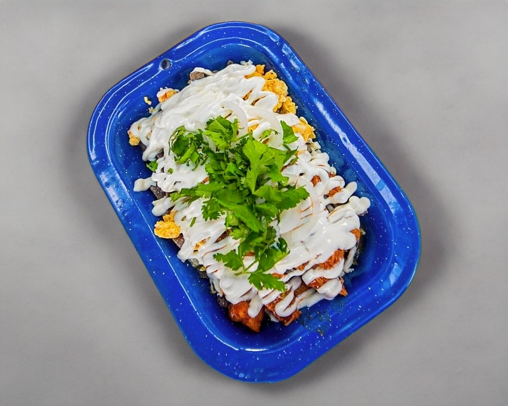 Totopos de maíz azul o blanco, tu guisado favorito y salsa roja o verde. Servidos con crema, queso fresco, cebolla y cilantro