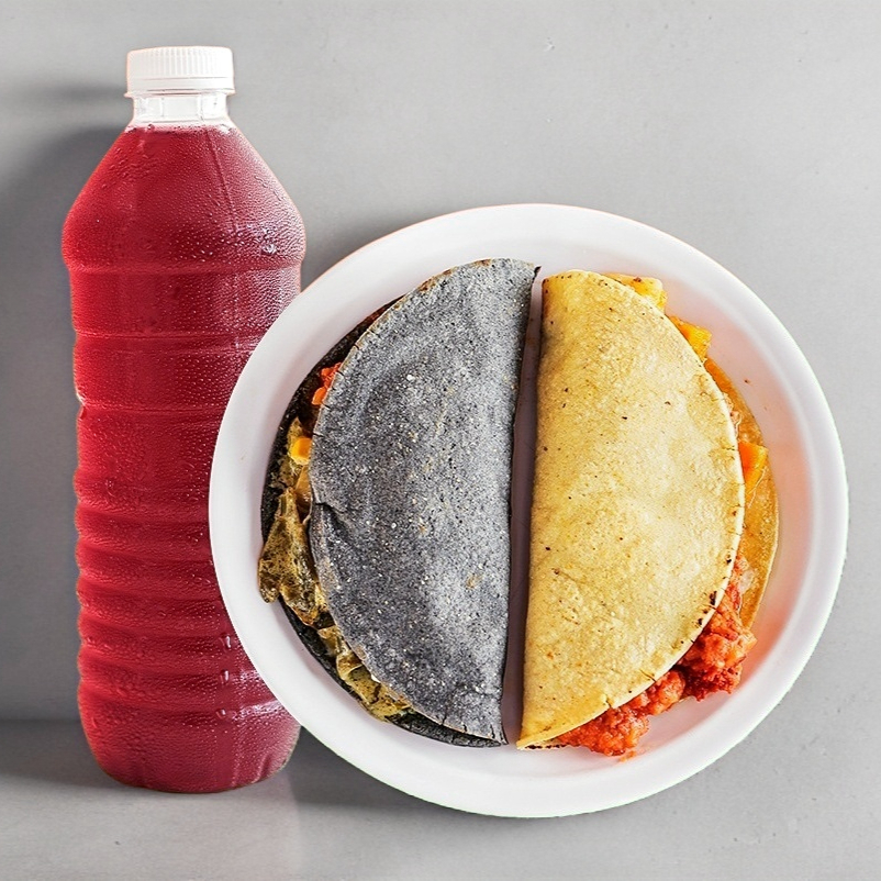 Tortilla artesanal de maíz azul o maíz blanco. Con opción de elegir un guisado.