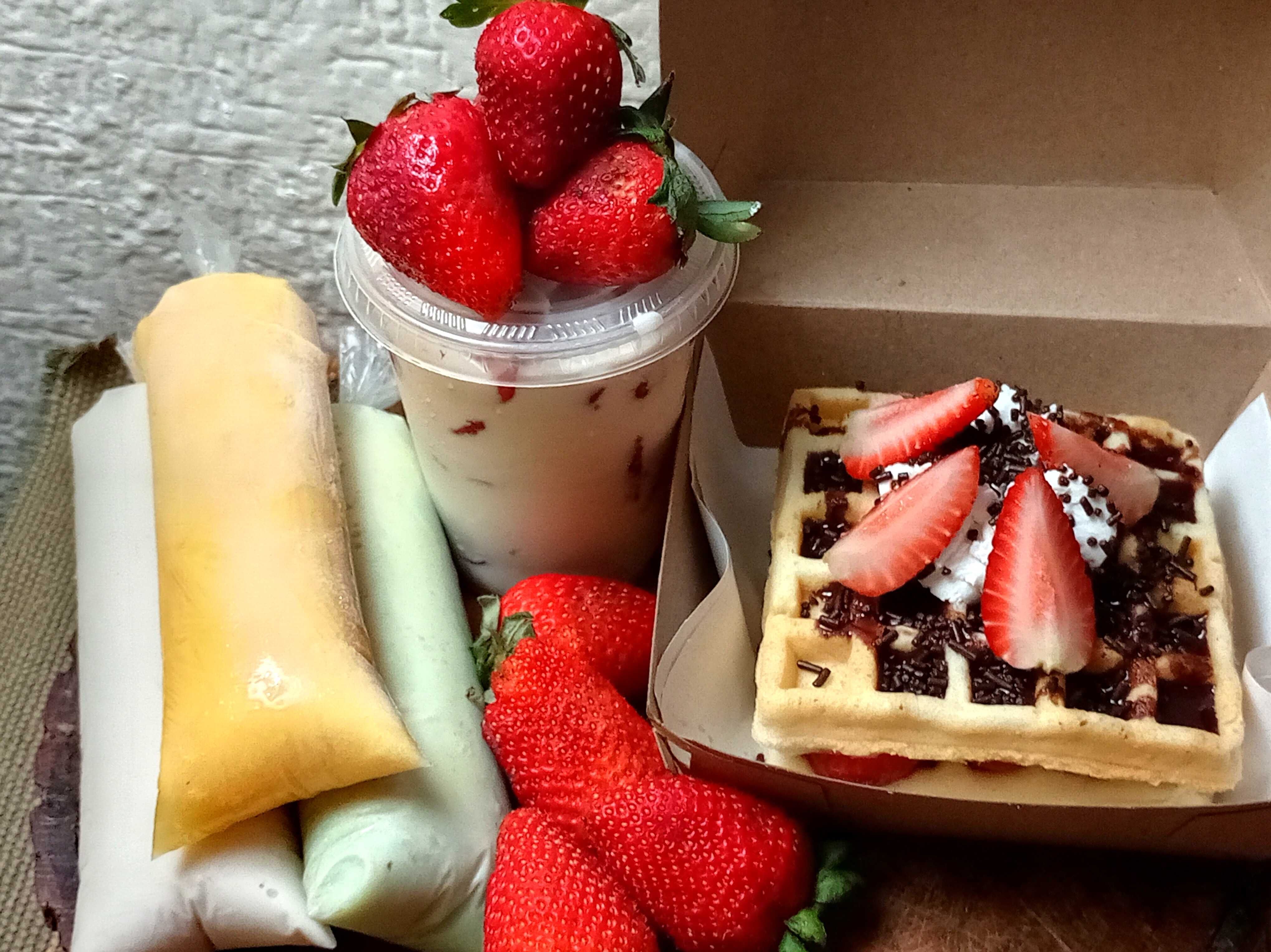 wafle con chocolate y fresas*1 + Frappe de Fresa*1 puede cambiar el sabor de frappe o wafle por el mismo precio mandar la dedicatoria y nombre a quien se dirige