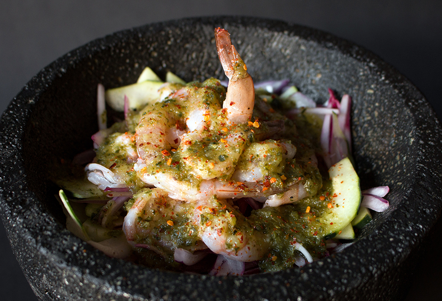 Camarones frescos en nuestra salsa de aguachile verde especial. Para los amantes de lo picosito.