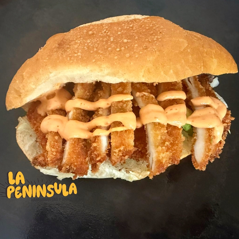 Bolillo, Milanesa de Pollo, Frijol, Cebolla Caramelizada, Lechuga, Tomate y Aguacate. ( Incluye: Aderezo Chipotle y Salsa ).