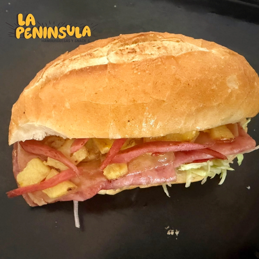 Bolillo, Jamón de pavo, Queso Gouda, Salchicha y Piña a la plancha. (Lechuga, tomate y salsas).