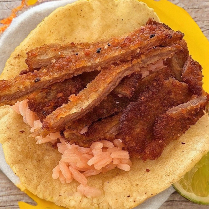 Milanesa de cerdo marinada con la receta de casa, crujiente empanizado y servido en tortilla hecha a mano