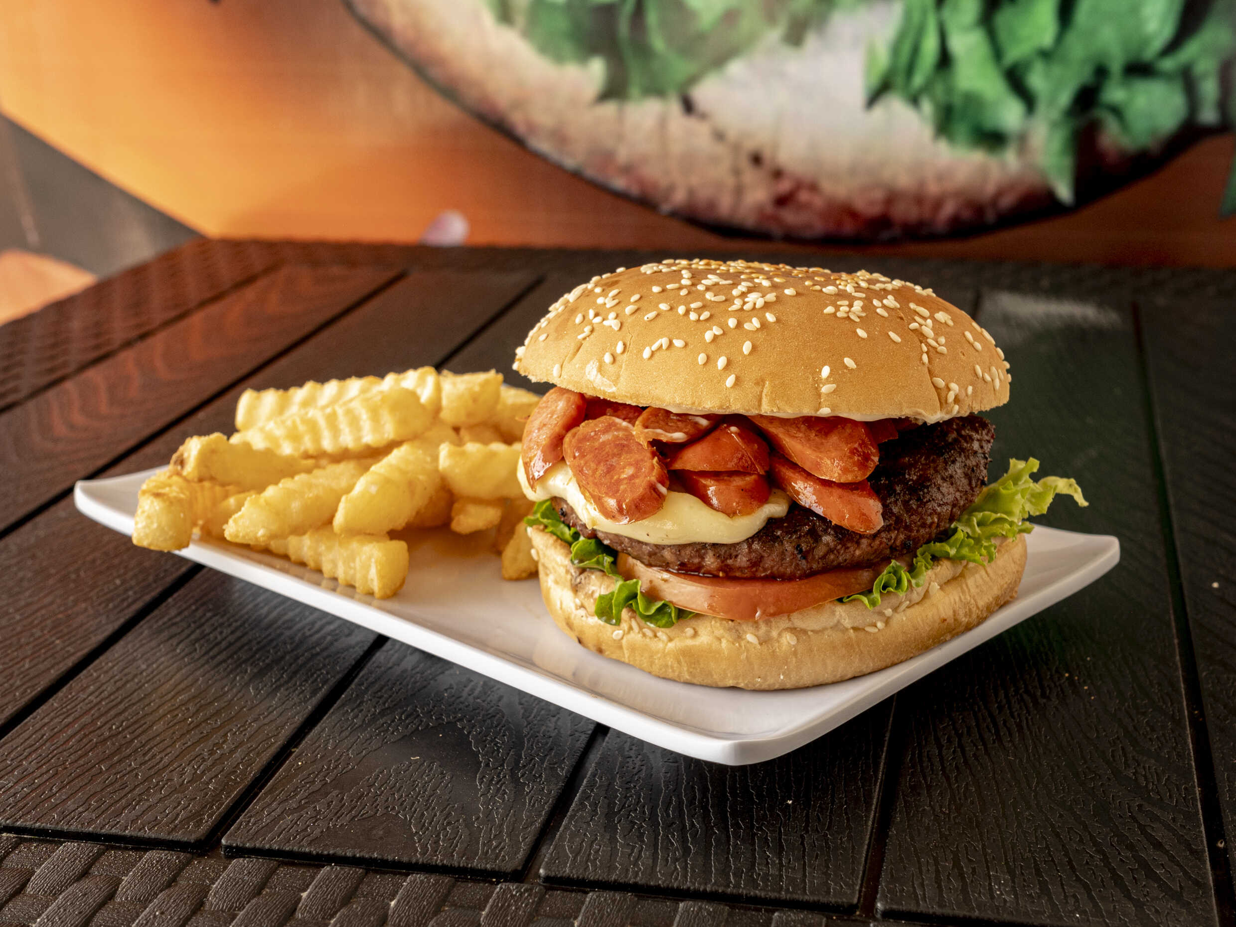 150 gr de res, lechuga, tomate, cebolla, queso y chorizo argentino.