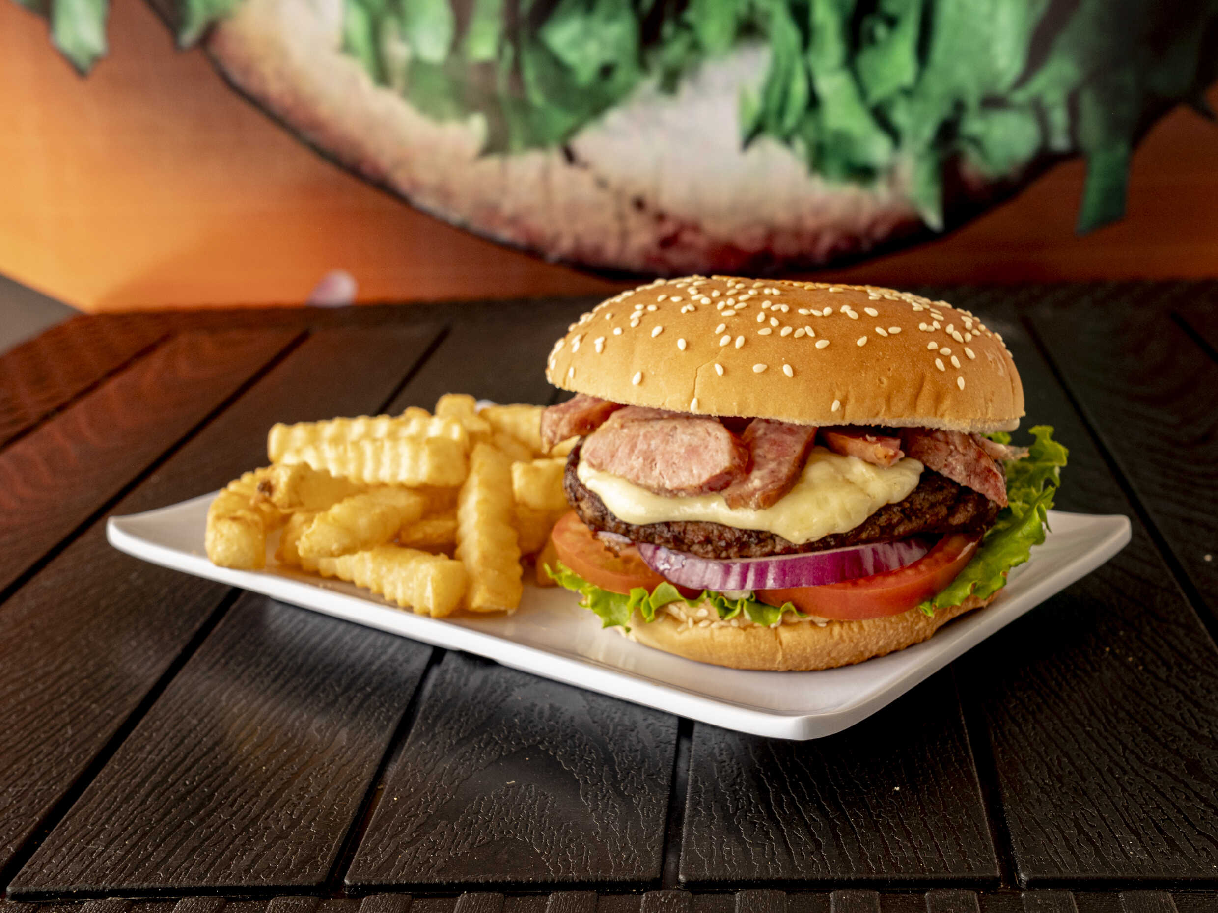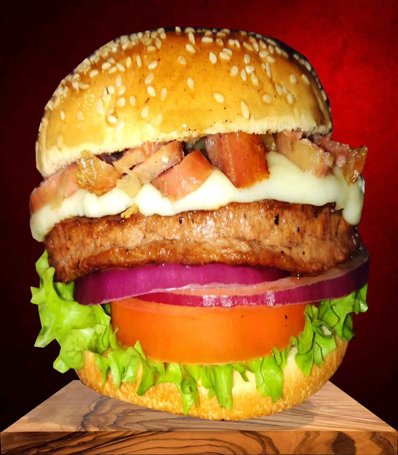 150 gr de res, lechuga, tomate, cebolla, queso y tocino.