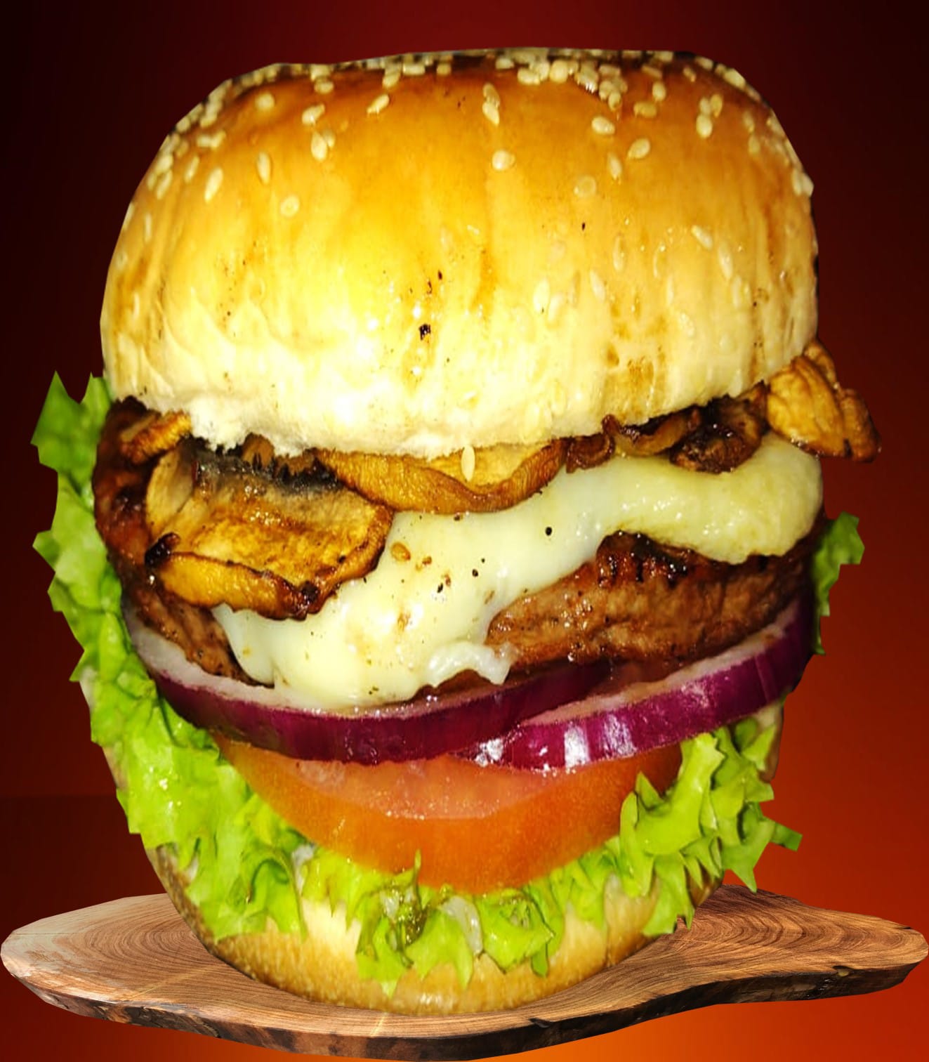 150 gr de res, lechuga, tomate, cebolla, queso y champiñones.
