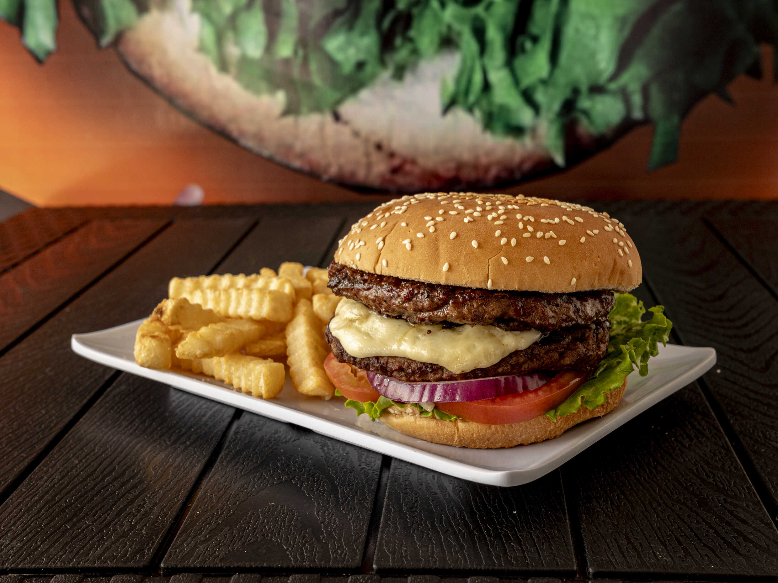300 gr de res, lechuga, tomate, cebolla y queso.