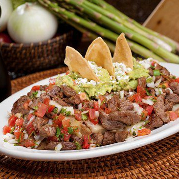 Totopos de maíz bañados en frijoles de la casa, crema, queso manchuego gratinado, trozos de arrachera y pico de gallo; acompañados de salsita de la casa