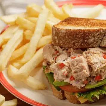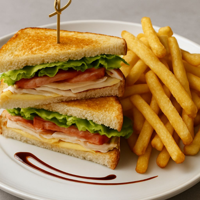 Pollo, jamón, tocino, queso, lechuga, y tomate; acompañado de papas a la francesa