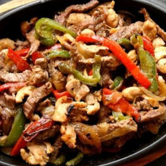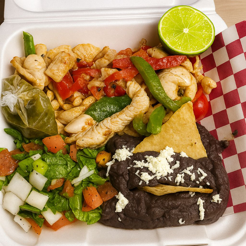 Fajitas de arrachera y poloo, con pimientos y cebolla; acompañadas de frijoles, ensalada y salsa de la casa