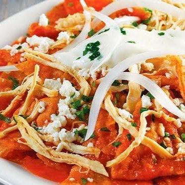 Totopos de maíz, bañados en la salsa de su elección, acompañados de cebolla, queso y crema