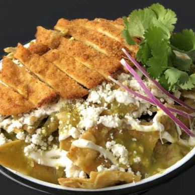 Totopos con la salsa de su elección, con queso, crema y cebolla; con milanesa de pollo empanizada