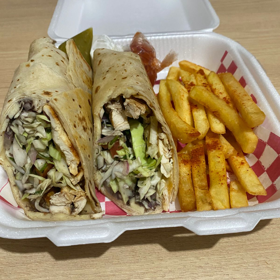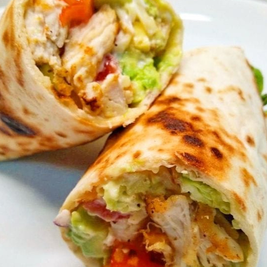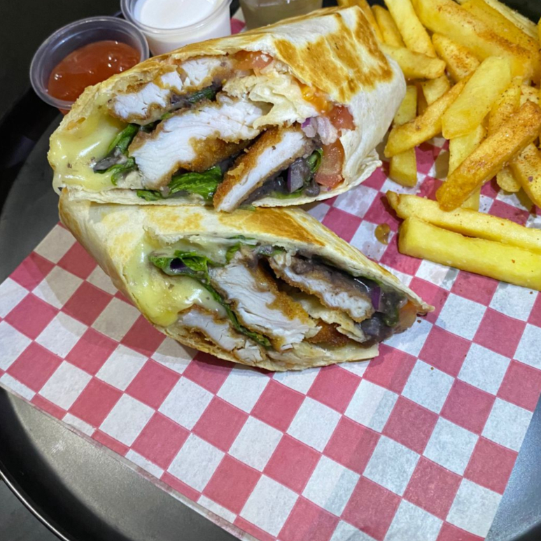 Tortilla de harina XXL, con pechuga de pollo, tomate, lechuga, cebolla y frijoles; acompañado de papas a la francesa y salsa dela casa