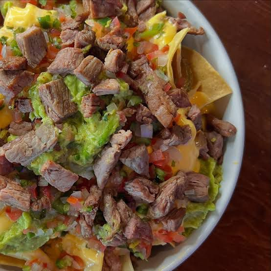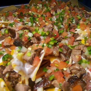 Totopos de maíz bañados en frijoles de la casa, crema, queso manchego, trozos de arrachera y pollo y pico de gallo; acompañados de salsita de la casa