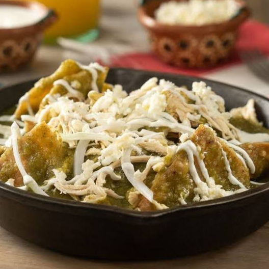 Totopos de maíz con la salsa de su elección, con pechuga de pollo desmenuzada, acompañados de queso, crema y cebolla