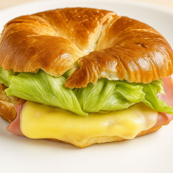 Delicioso crossaint con jamón, queso manchego, lechuga, tomate y cebolla