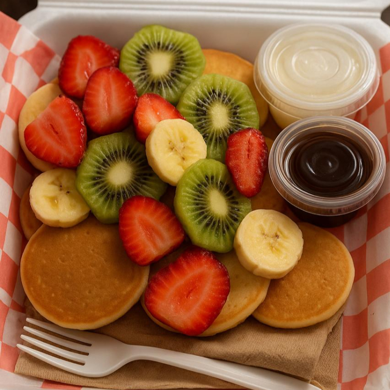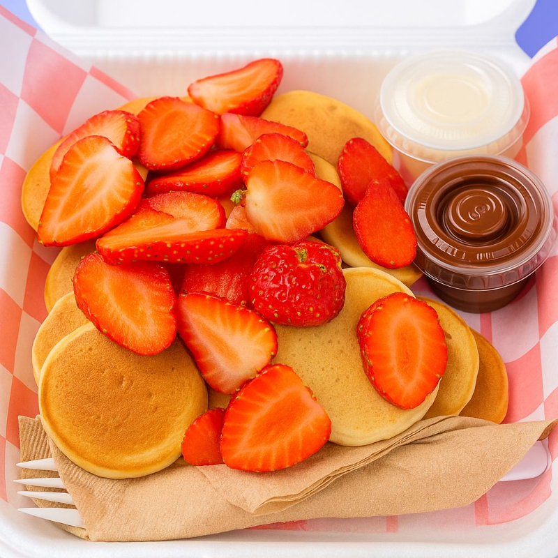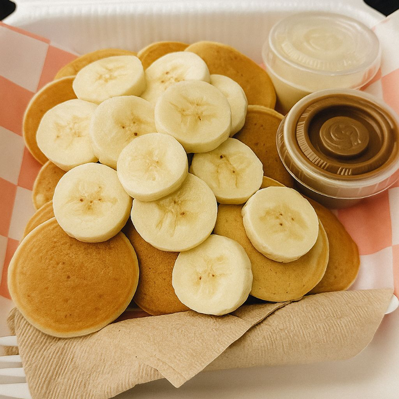 12 piezas de mini hotcakes, con un untable y un topping a elegir
