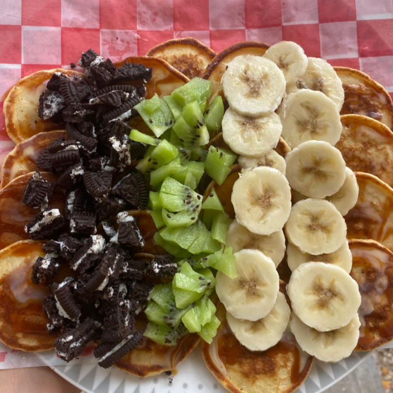 20 piezas de minihotcakes con un untable y un topping a elegir