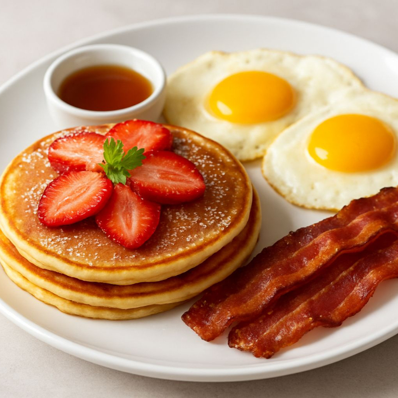3 piezas de hotcakes, con 1 untable y 1 toppimg a elegir; acompañados de 2 piezas de huevos revueltos ó fritos a elección, con 2 tiras de tocino