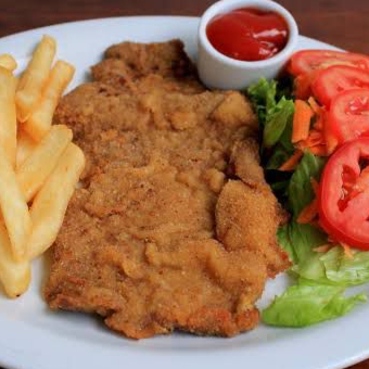 Milanesa de pollo empanizada, acompañada de ensalada y papas a la francesa