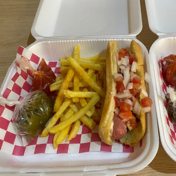 UN HOT DOG Con tocino, cebolla, tomate, acompañado de papas a la francesa