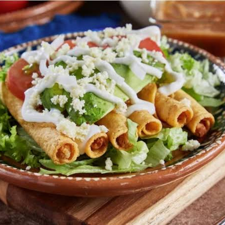 6 piezas de tacos con pollo, servidos con lechuga, tomate, cebolla, queso y crema