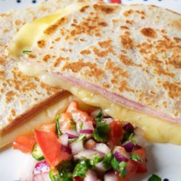 4 piezas de tortilla de harina con jamón y queso, acompañada de papas a la francesa y pico de gallo