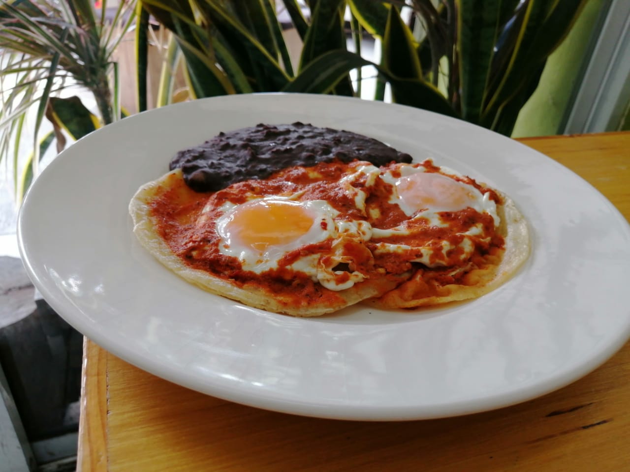 Huevos estrellados sobre tortilla bañados con salsa servidos con frijoles refritos