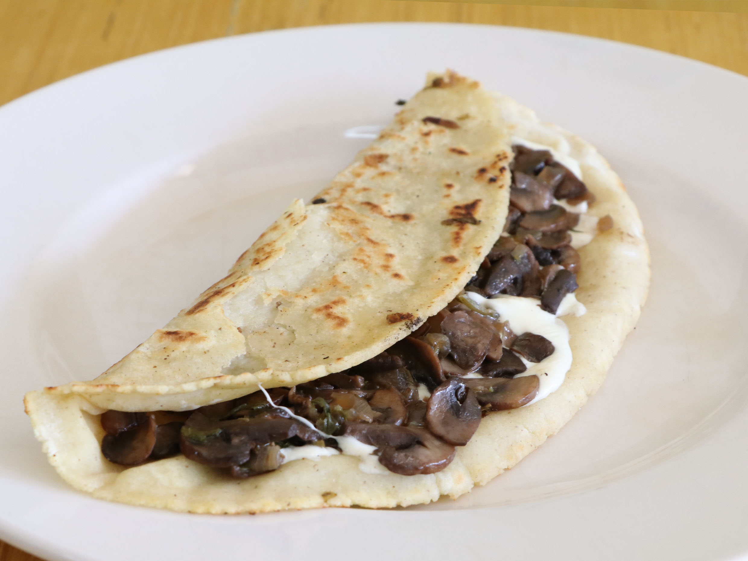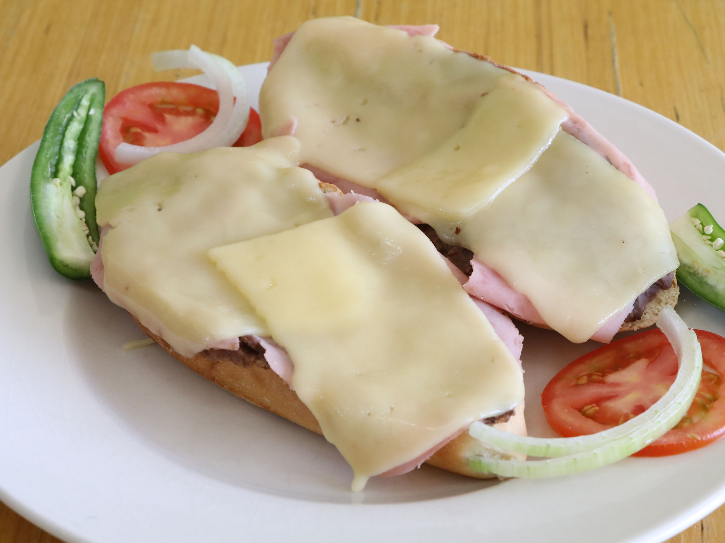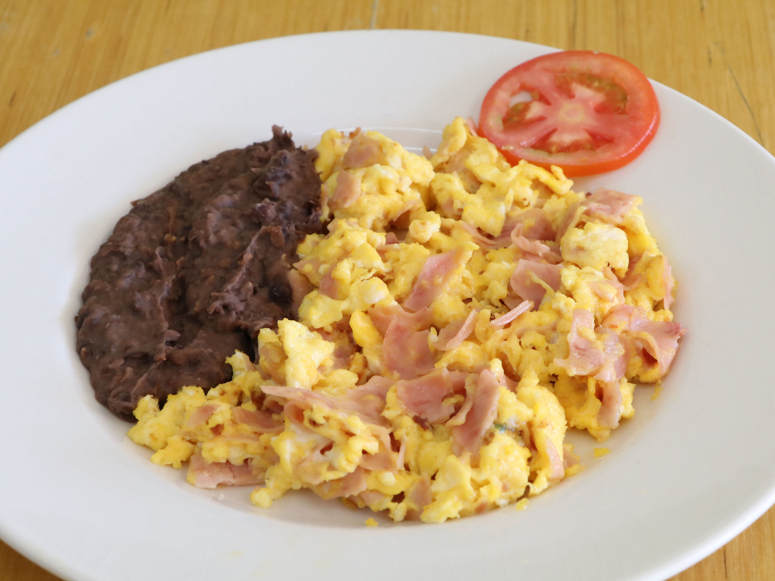2 huevos rellenos de jamón yqueso, servido con frijoles refritos y tortillas