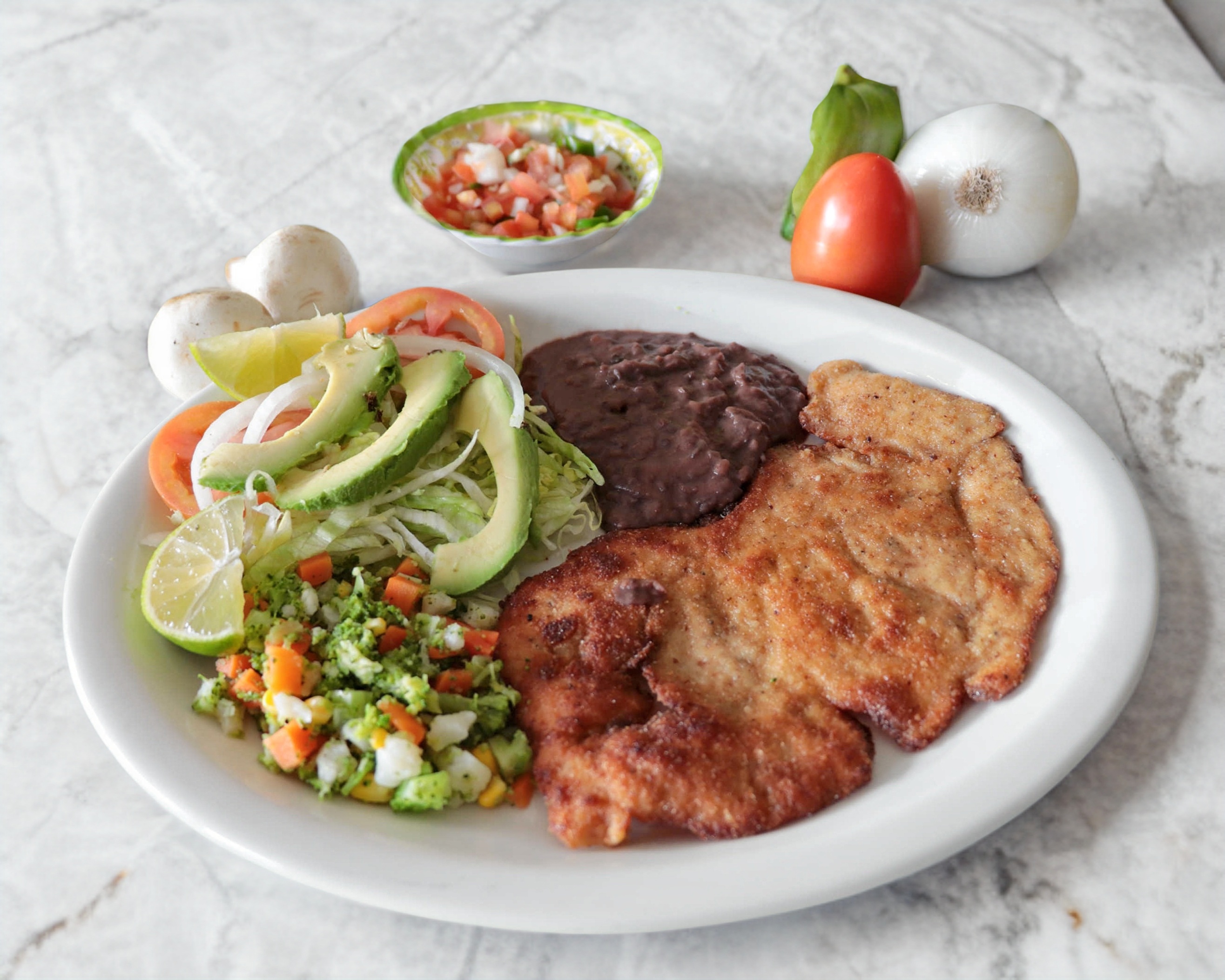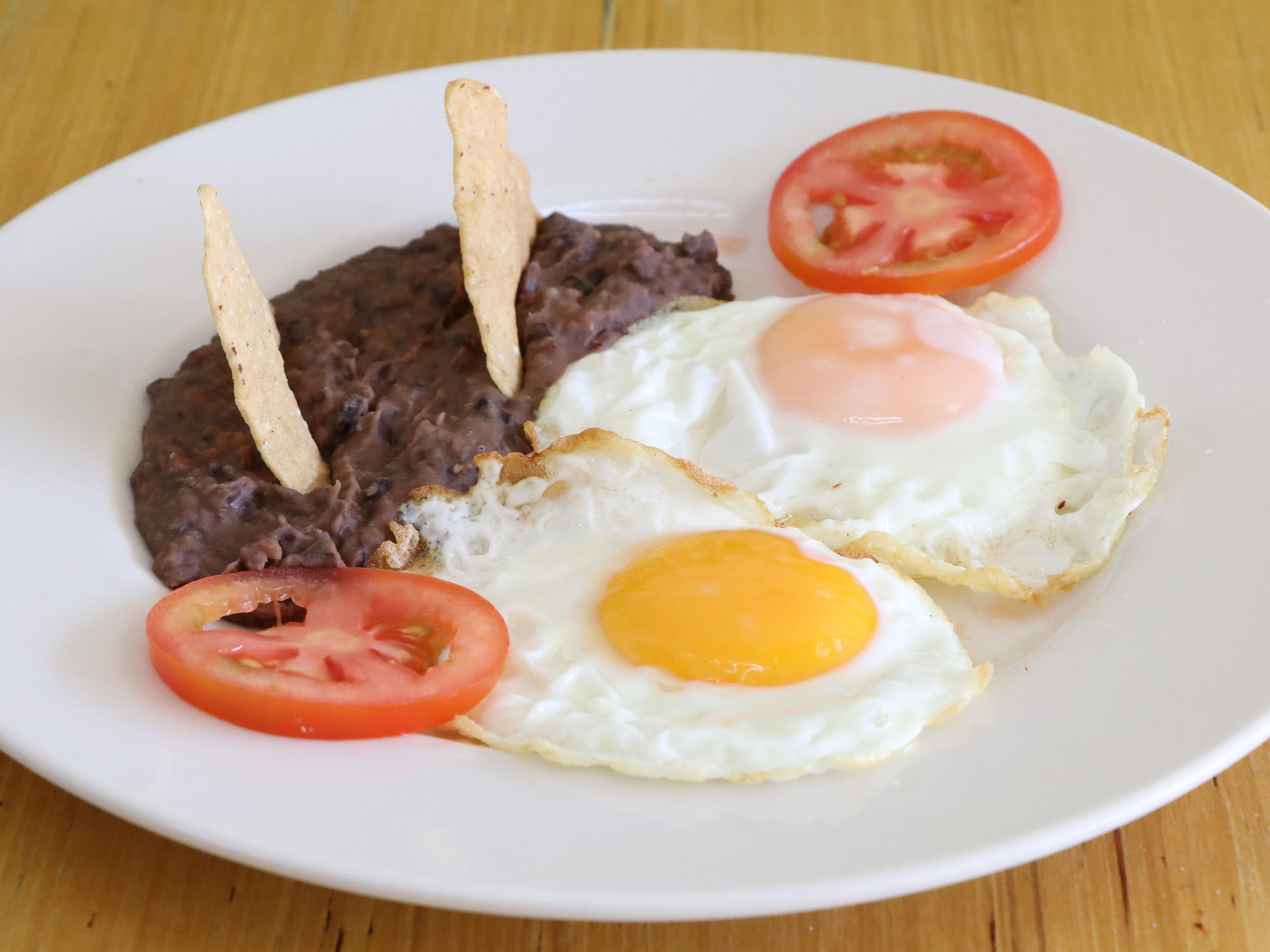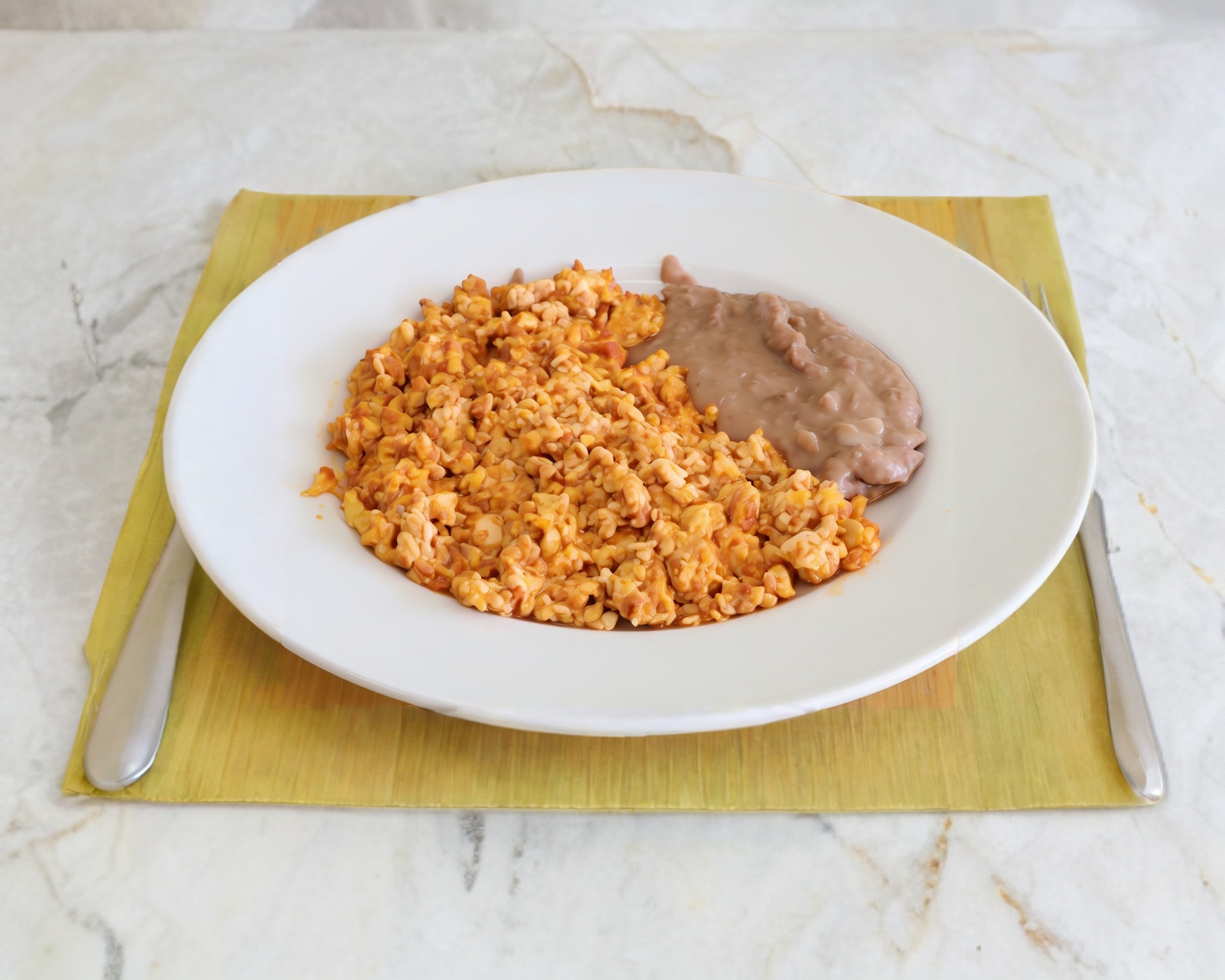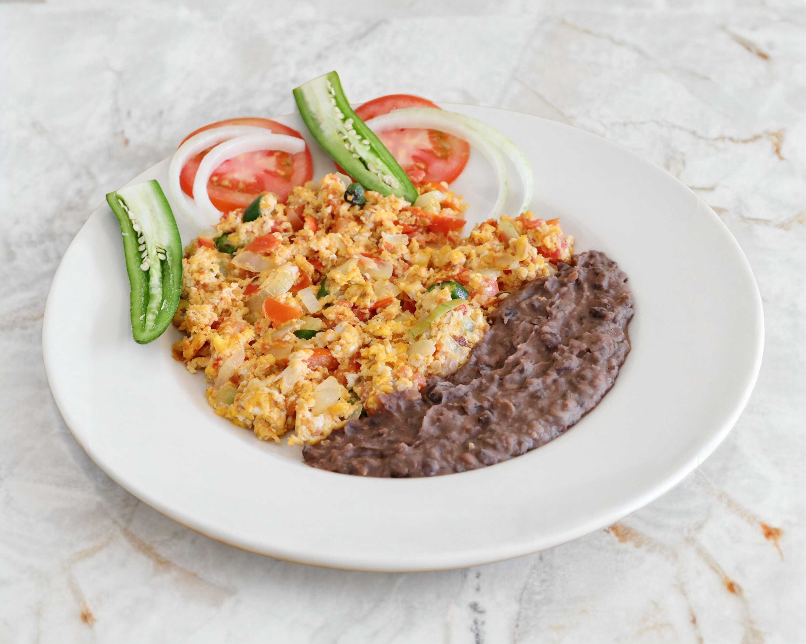 Servidos con frijoles refritos y 2 huevos revueltos o estrellados