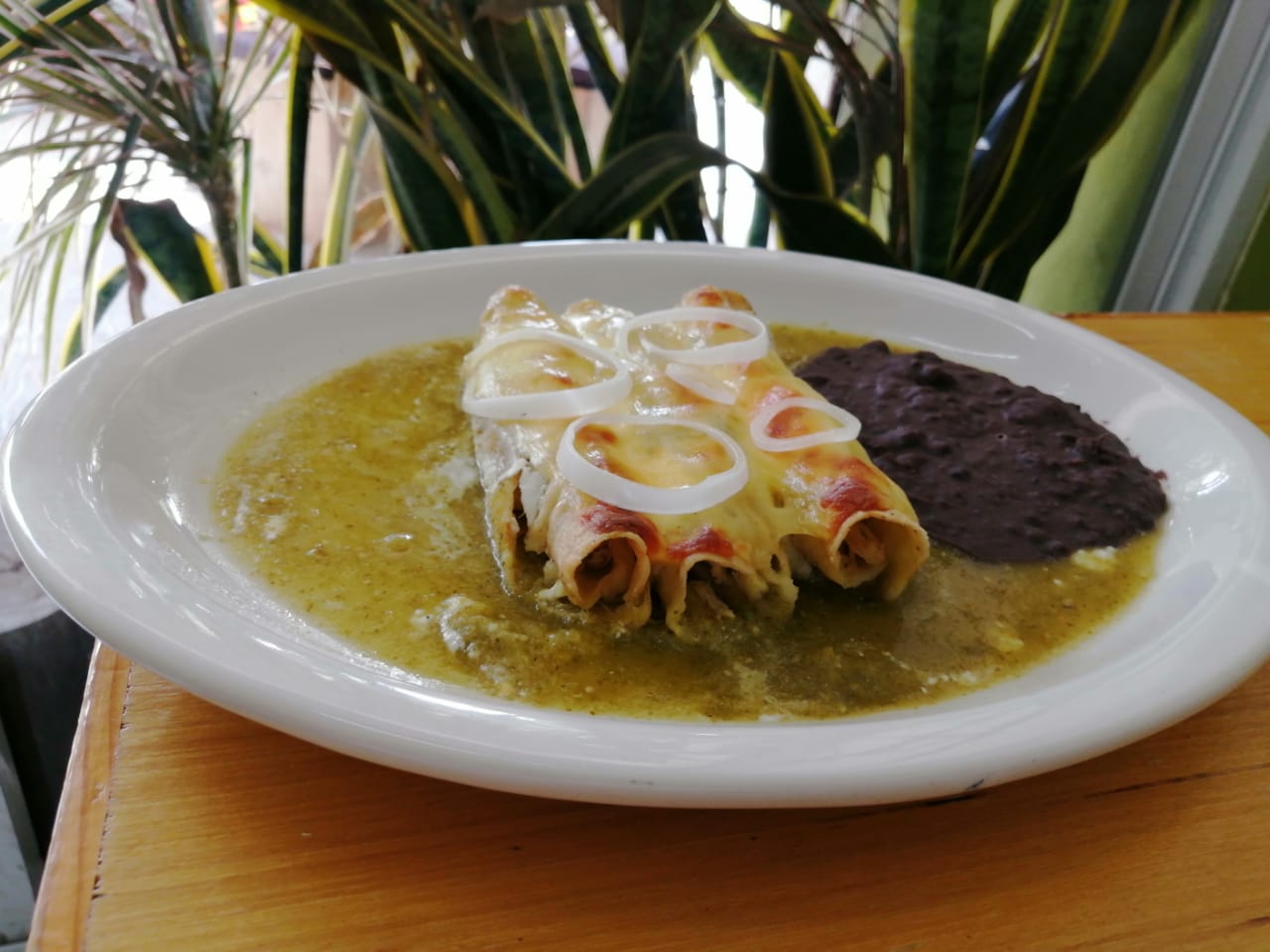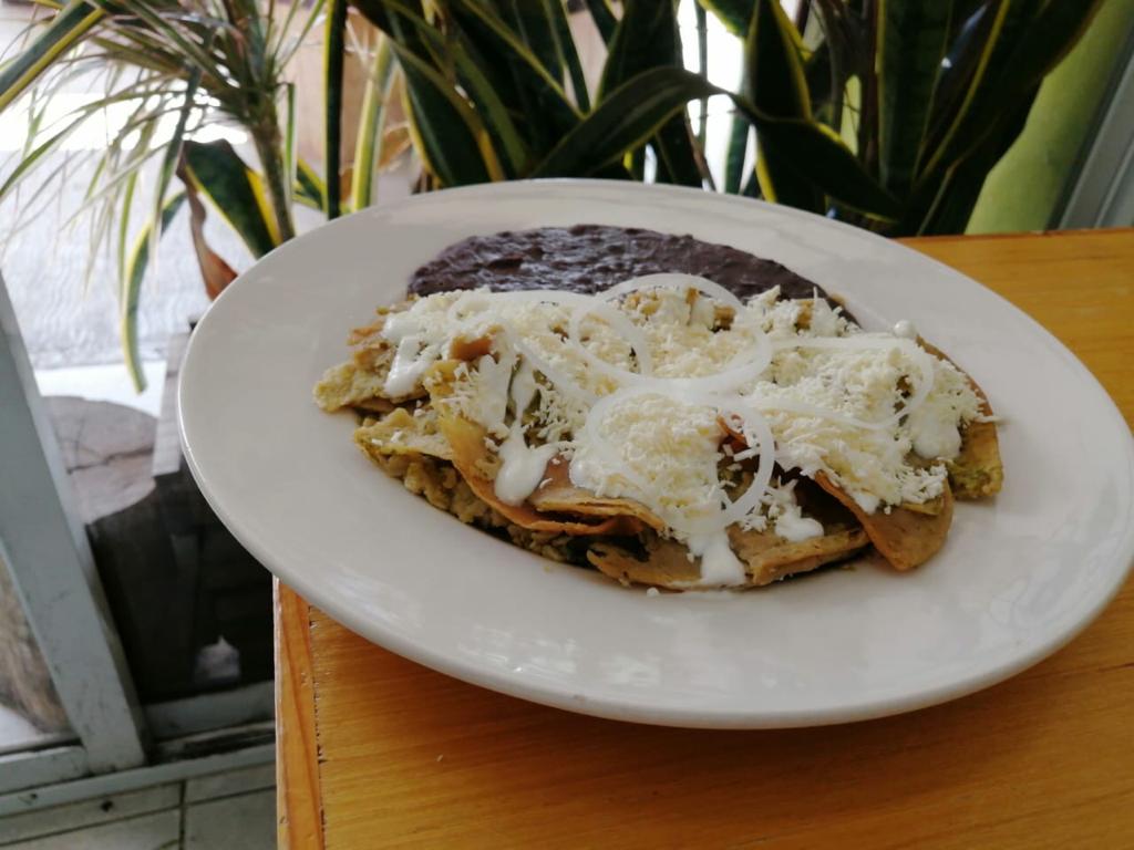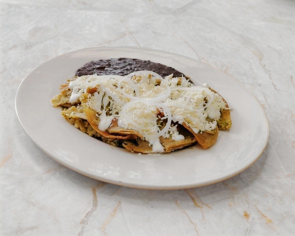 Ricos chilaquiles verdes con crema queso y cebolla acompañados ok frijoles refritos
