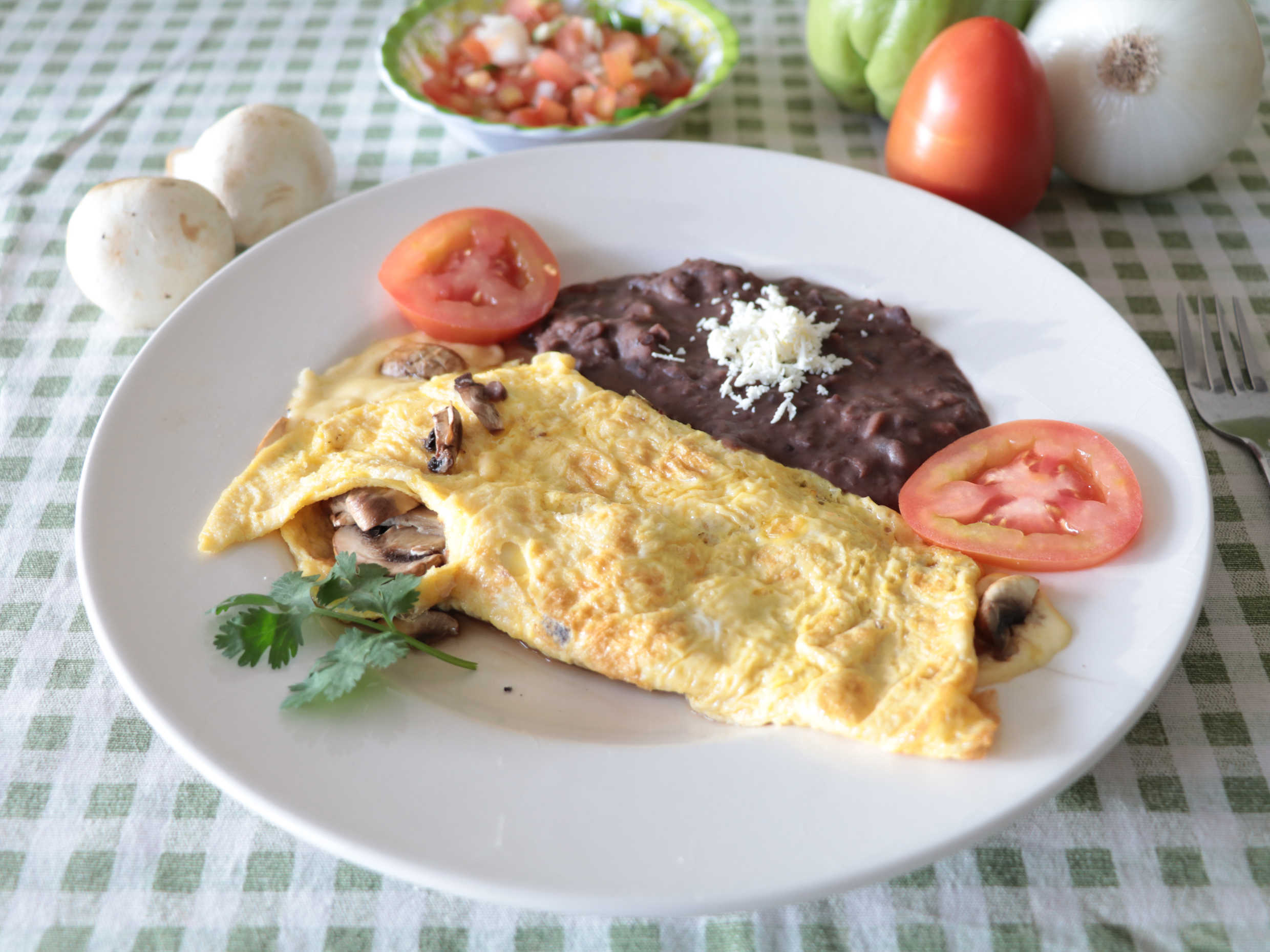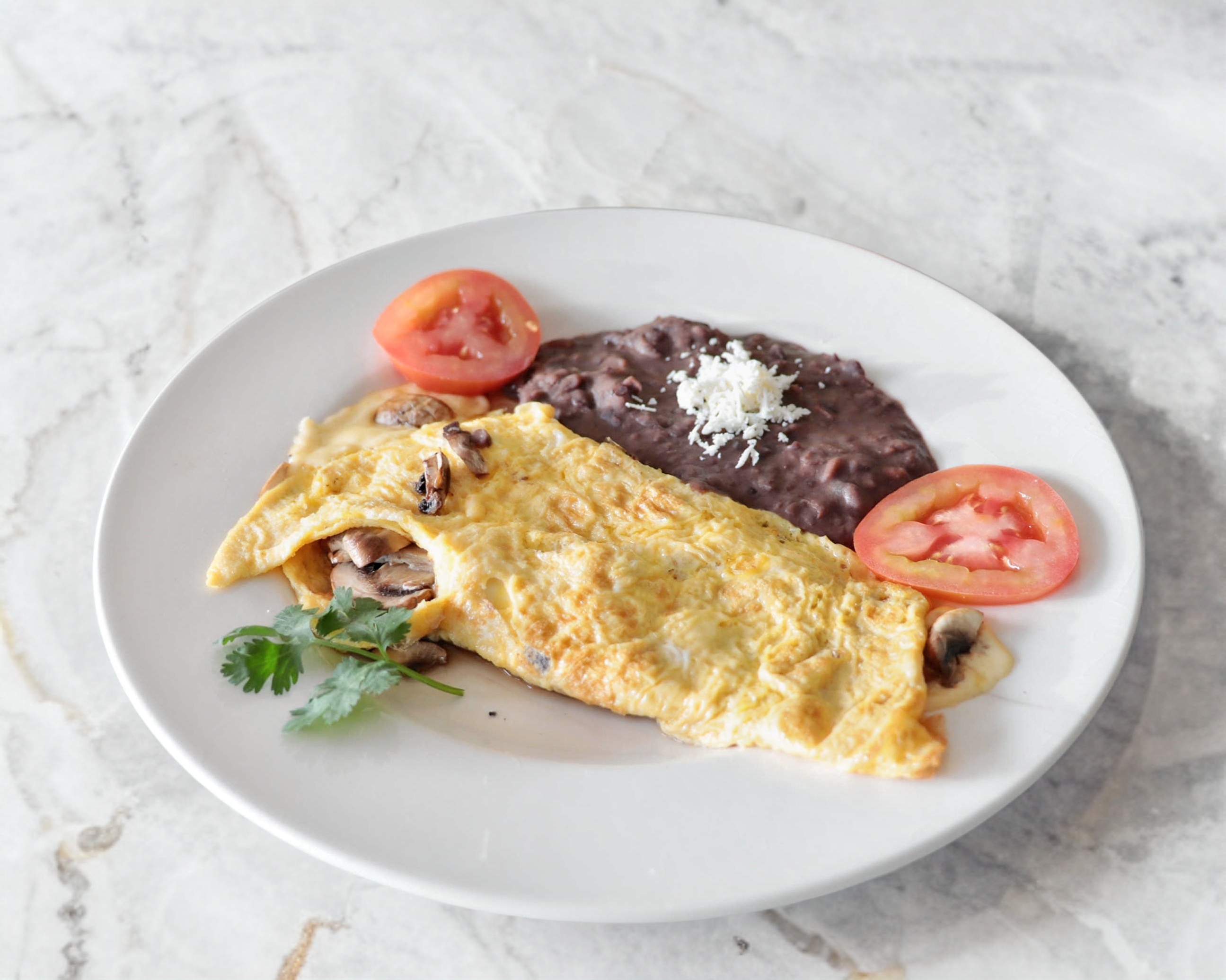 2 huevos en omellet rellenó de vejetales y queso,servido con frijoles refritos y tortillas