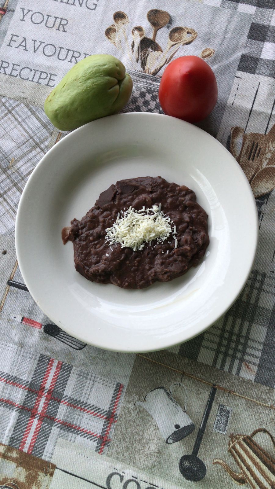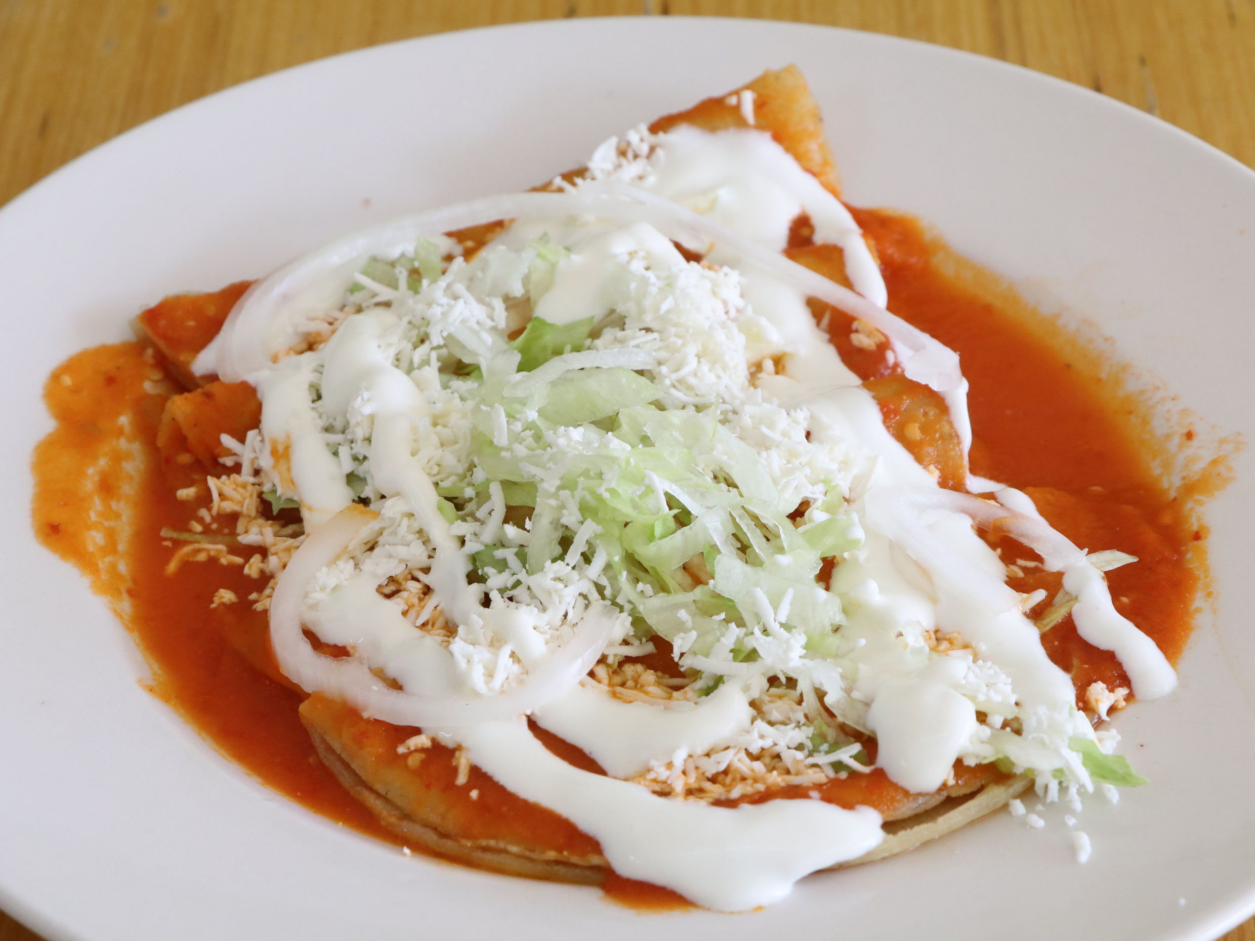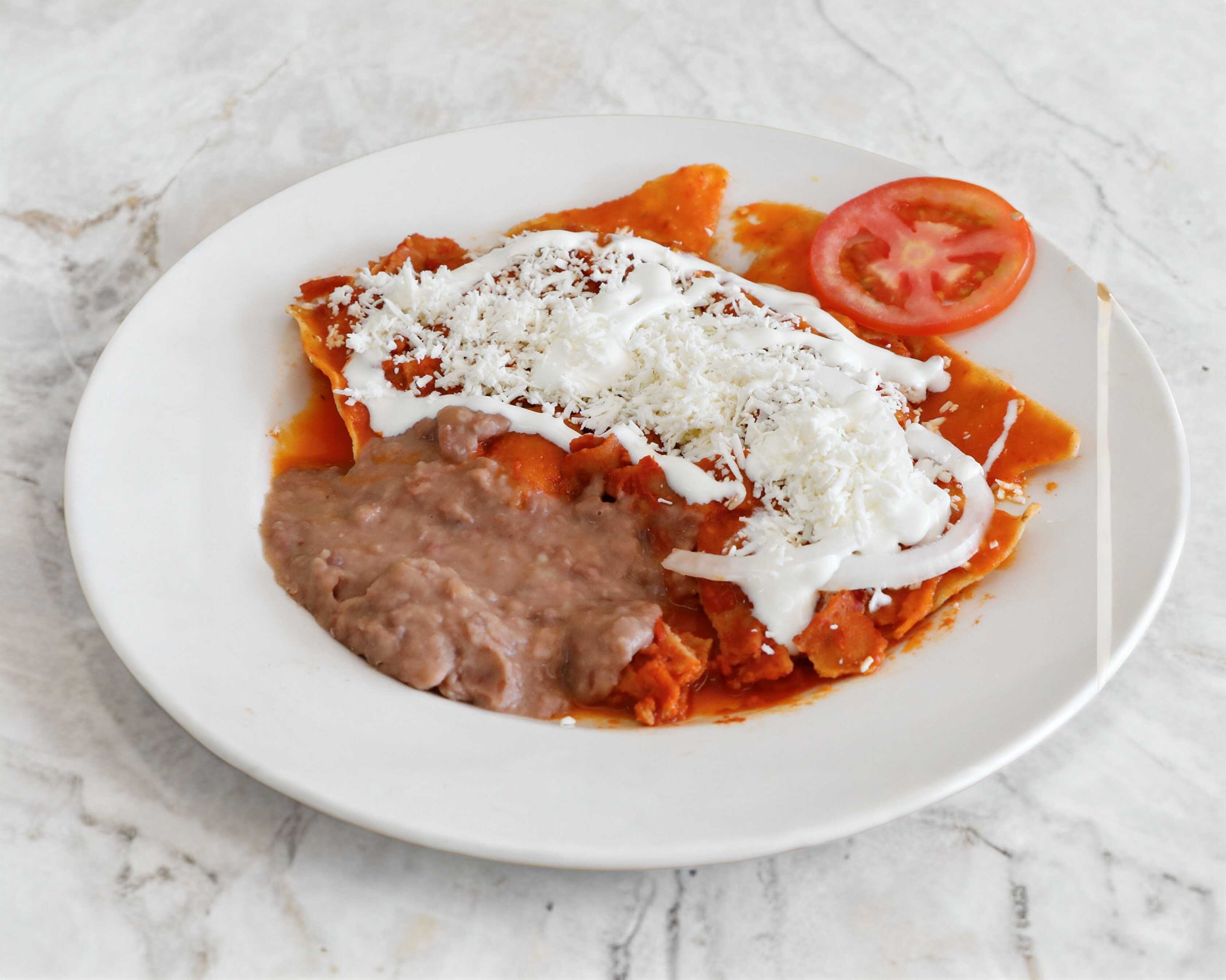 Rojos. Con crema y queso y cebolla servidos con frijoles refritos
