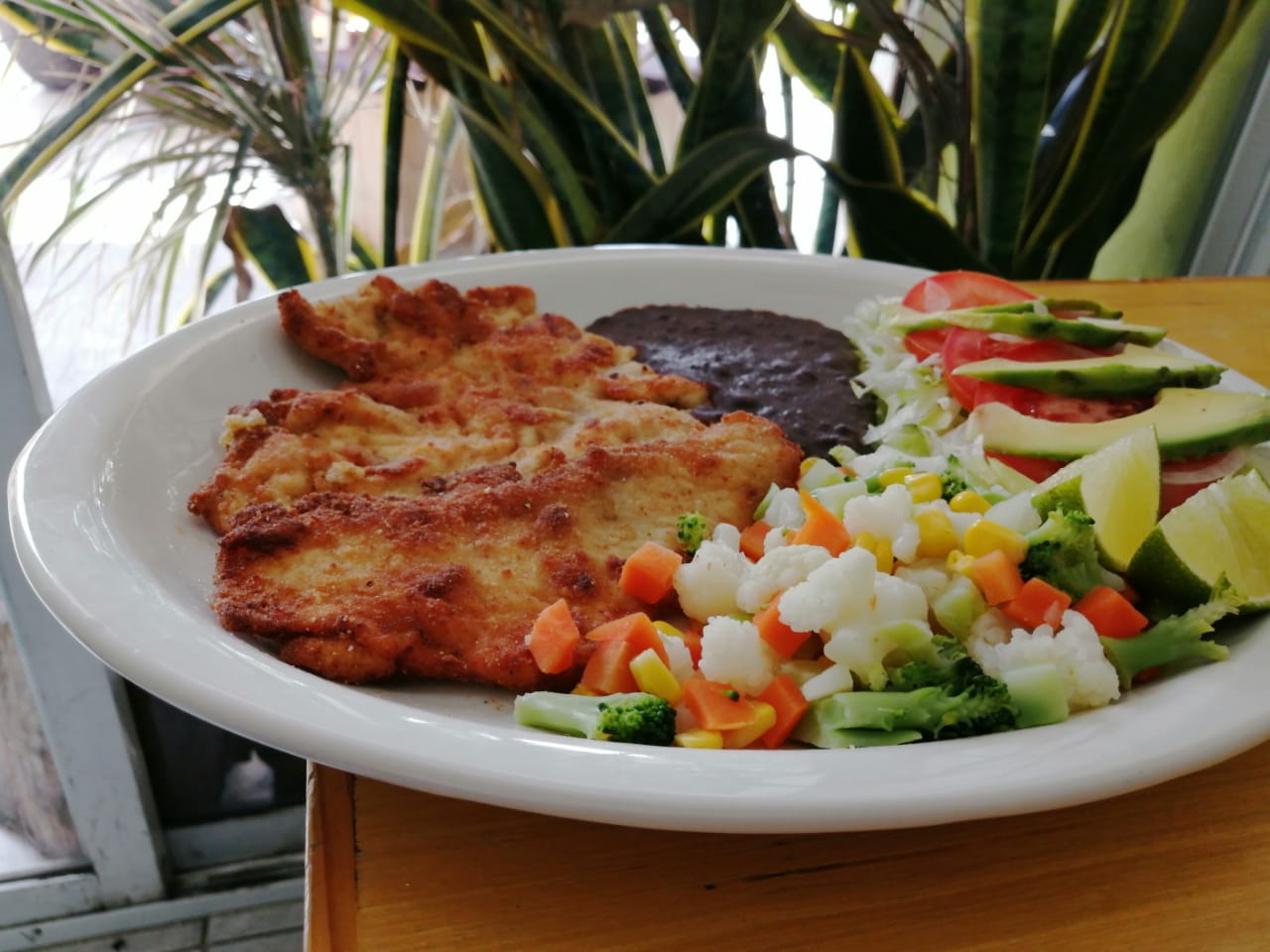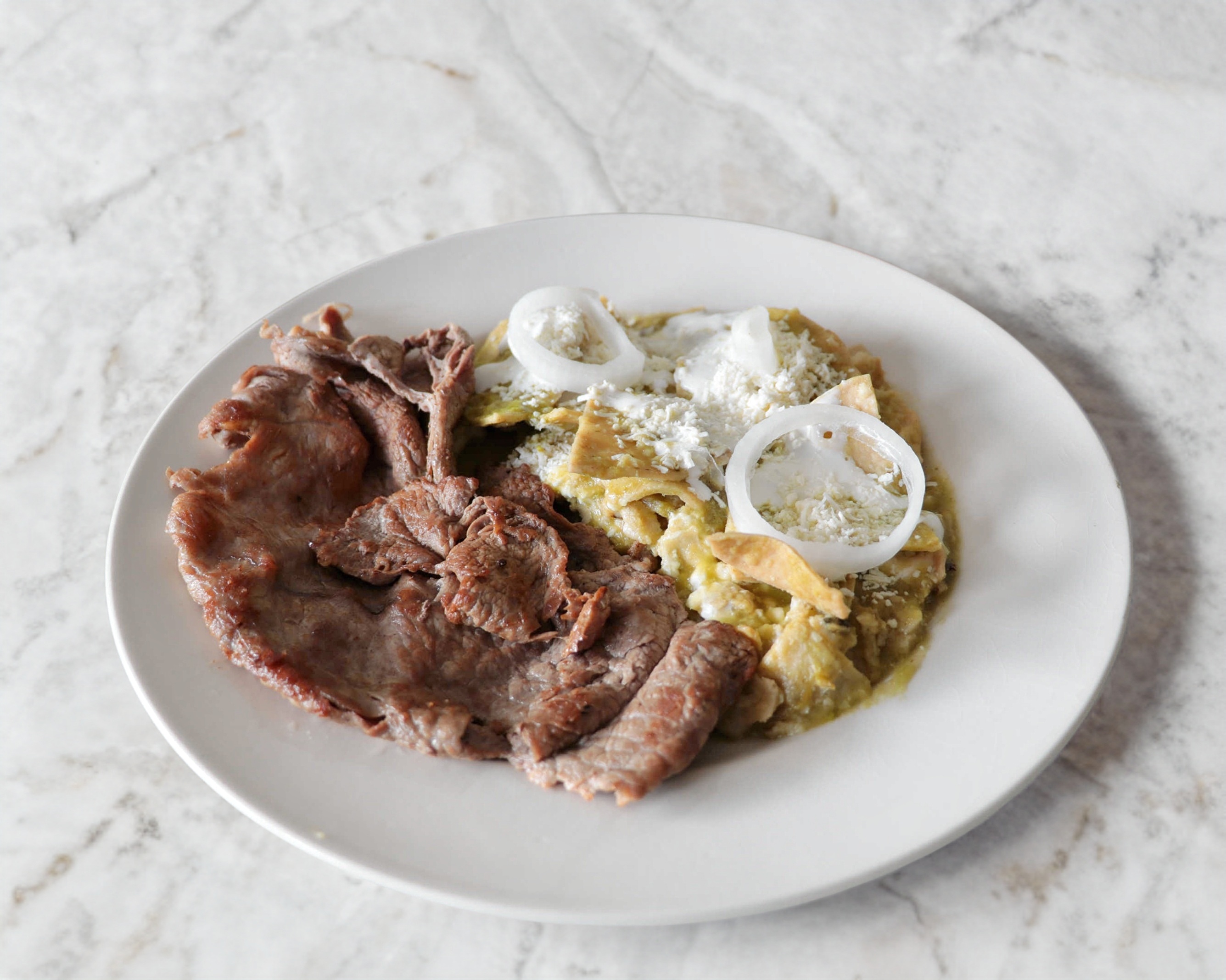 Chilaquiles con crema y queso acompañado de bistec ,frijol refrito y pan