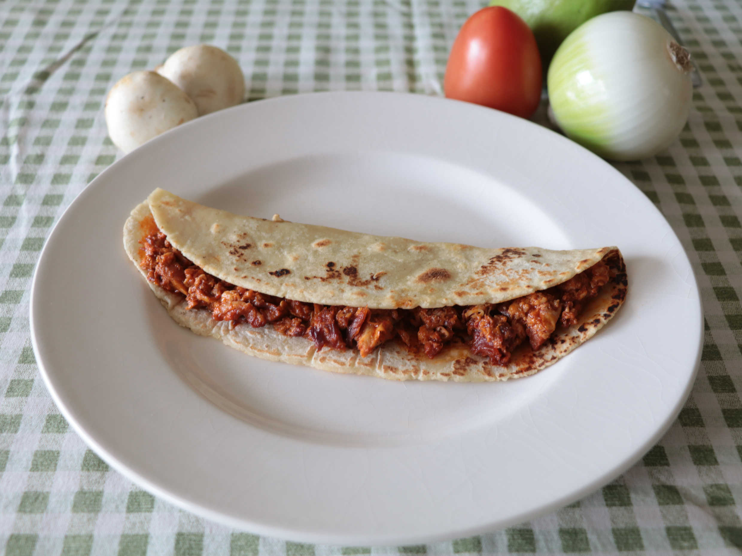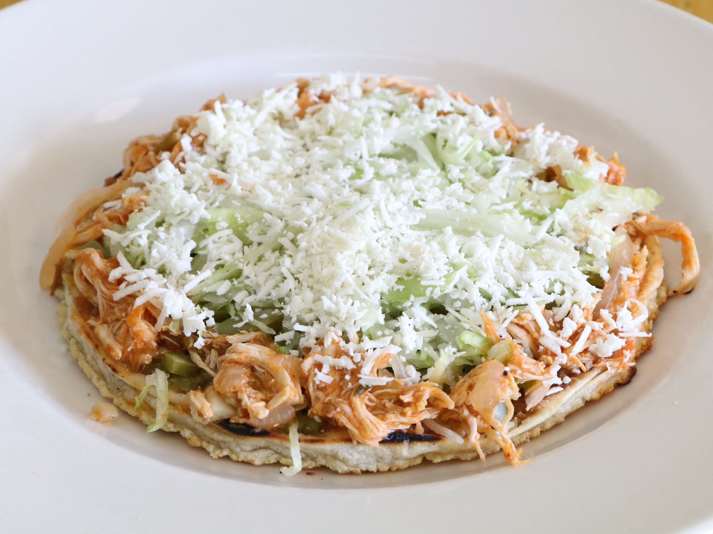 Lleva frijol ,cebolla, papa con chorizo lechuga queso rayado y salsa