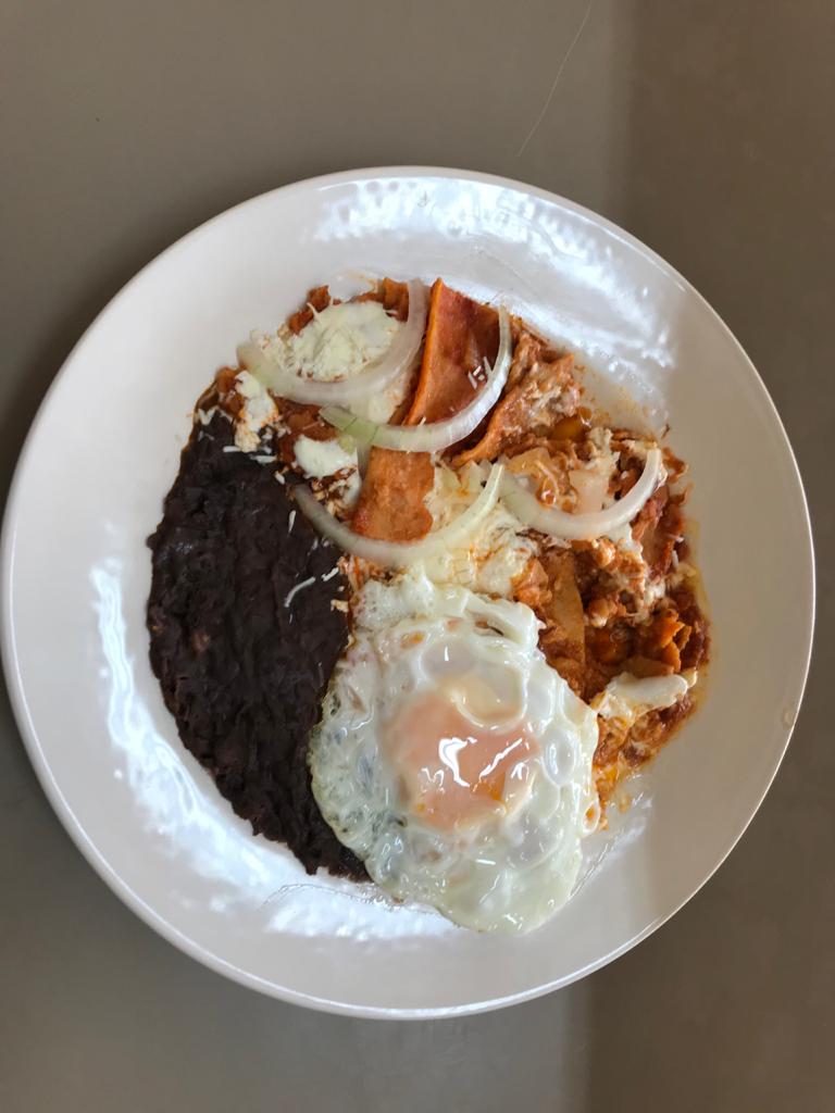 Exquisitos chilaquiles con pollo con crema y queso cebolla y frijoles refritos