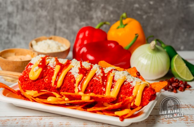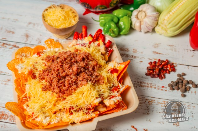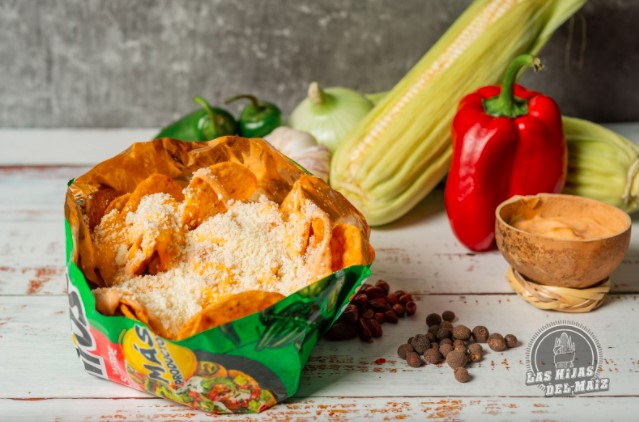 Ruffles Doritos y Takis, Esquite, Queso en polvo, Queso amarillo, aderezo o mayonesa, crema, queso de bola y tocino