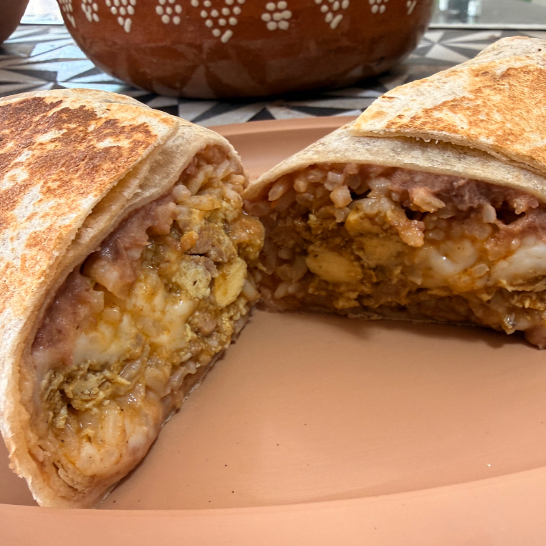 Tortilla de harina, arroz, frijol, queso, y salpicón (huevo con carne de cerdo)