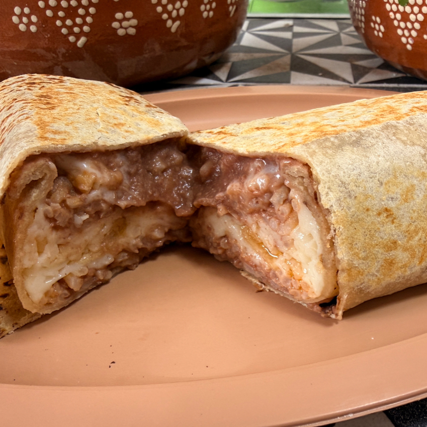 Tortilla de Harina, frijoles, arroz, y queso mozzarella