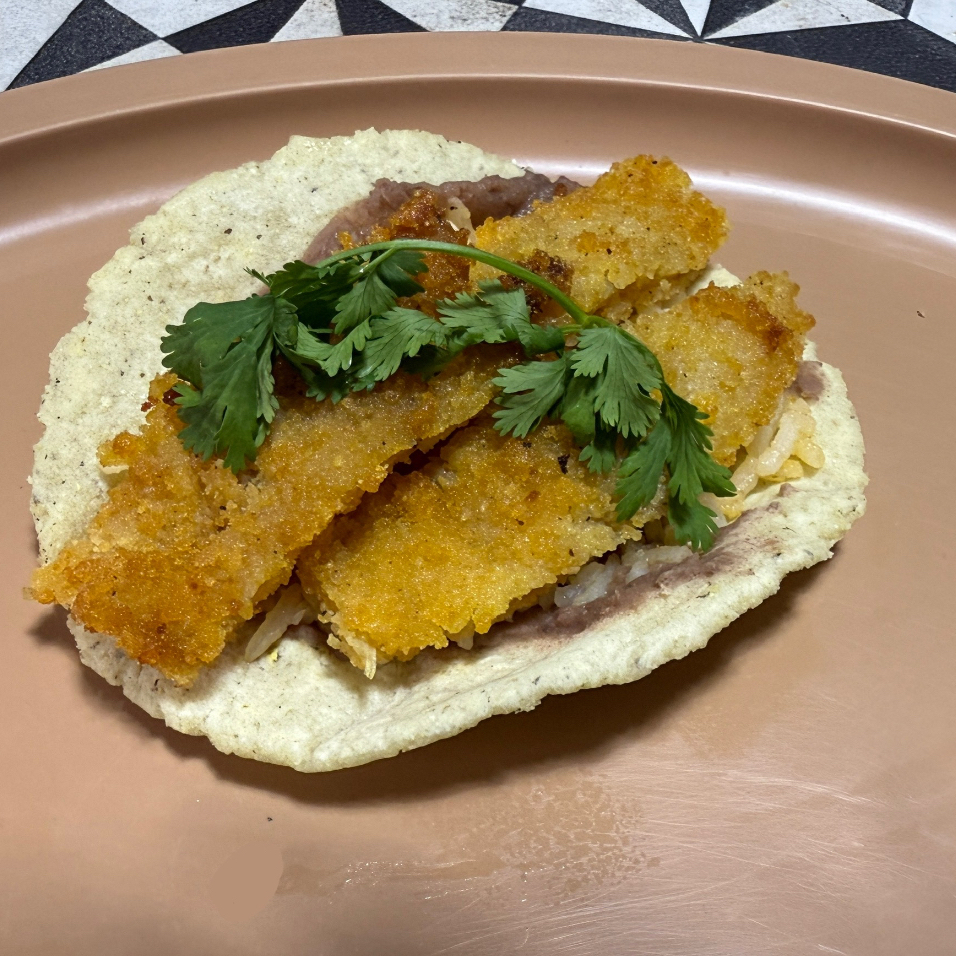 Tortilla de maíz hecha a mano, con arroz frijol, y pollo empanizado