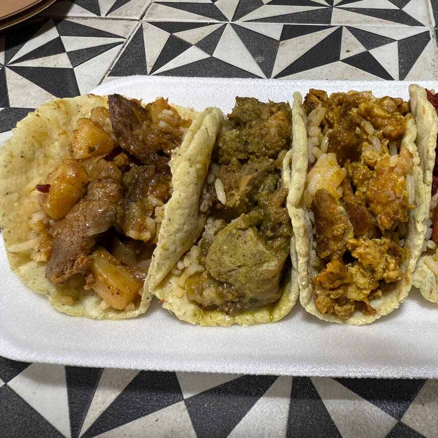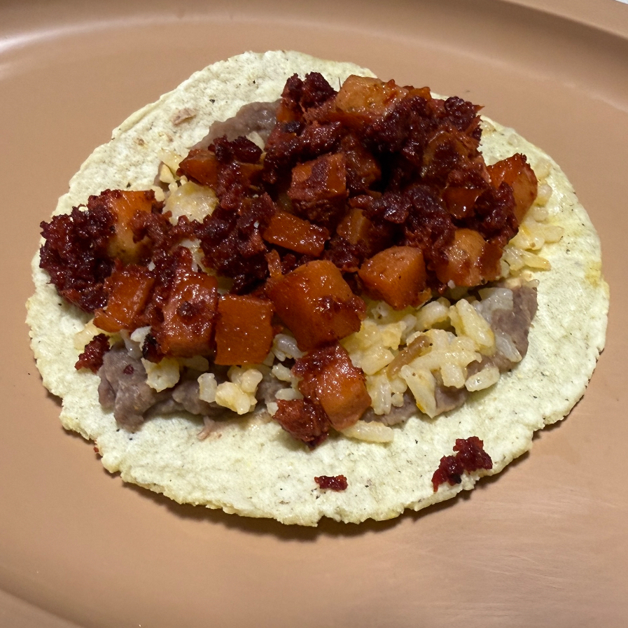 Tortilla de maíz hecha a mano, arroz y frijol, chorizo con papa