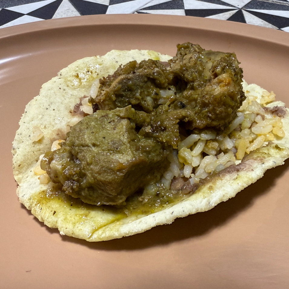 Tortilla de maíz hecha a mano, arroz y frijol, costilla de puerco en salsa verde