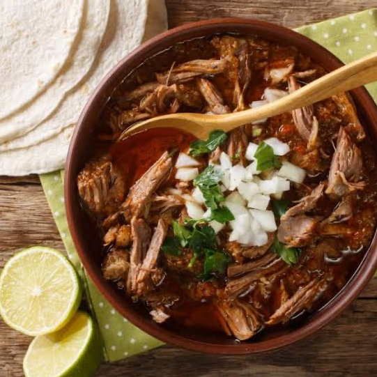 1 Litro de consume con carne de barbacoa de res, tortillas, cebolla, cilantro, y limón