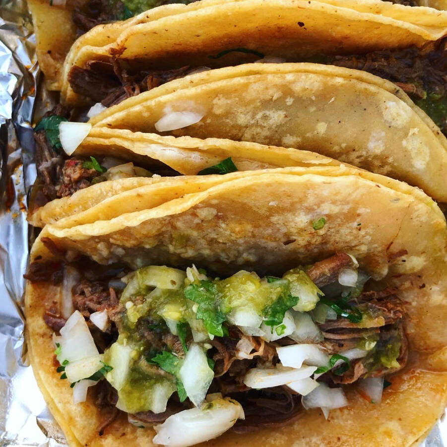 Tortilla de maíz, barbacoa de res, cebolla, cilantro, y limon