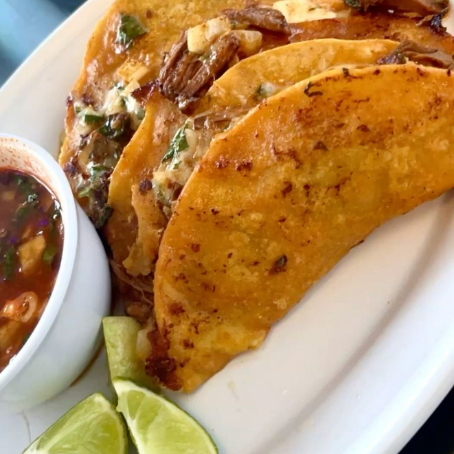 Tortilla de maíz, barbacoa de res, queso mozzarella, cebolla, cilantro (SIN CONSUME)