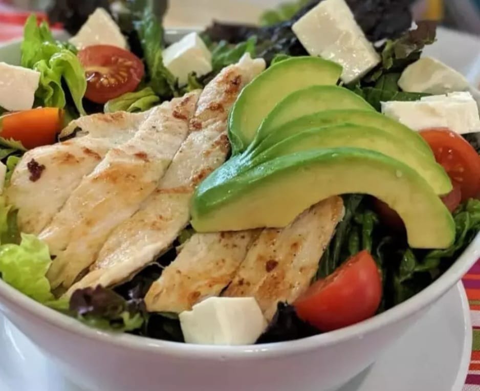 Mezcla de lechugas, aguacate, arandanos, queso panela, croutones, tomate cherry y zanahoria con la proteina de tu eleccion