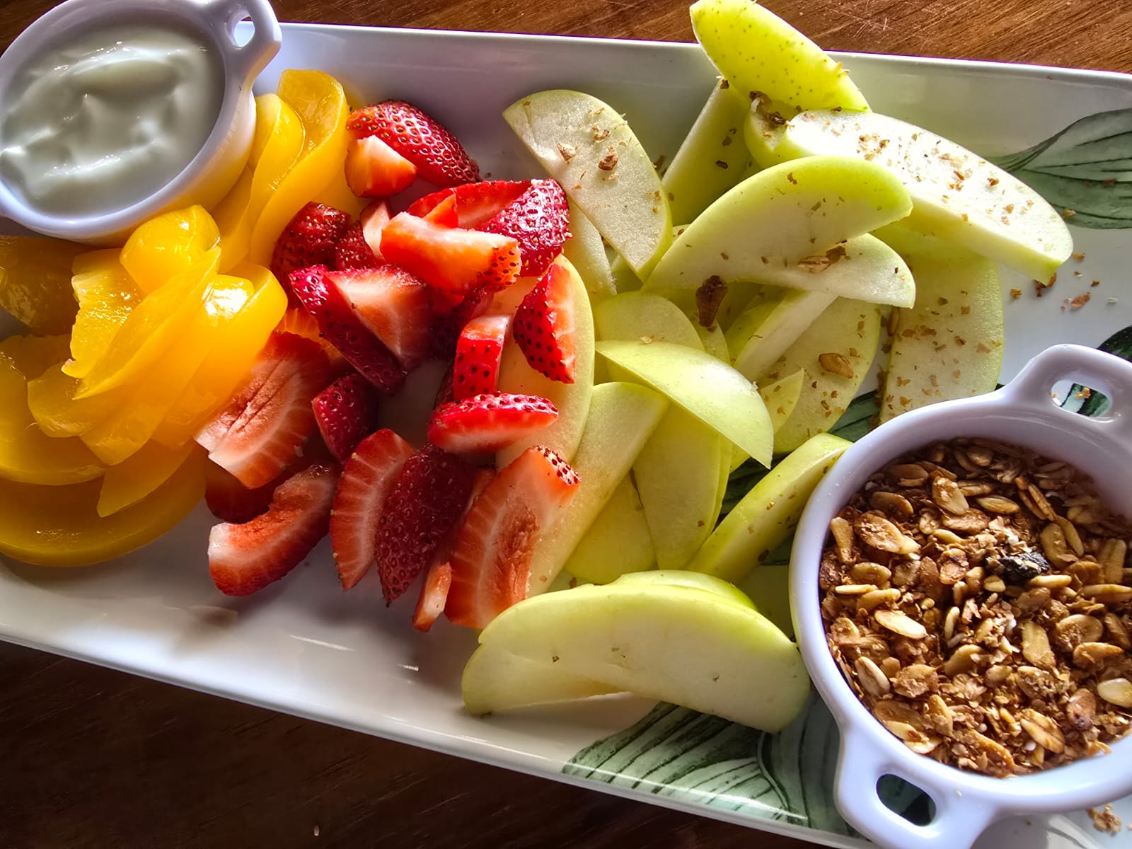 Con durazno, fresa y manzana, acompañado de yogurt, miel y granola