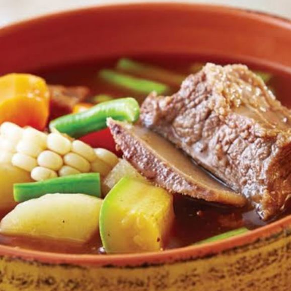 caldo de res con base de salsa guajillo y trozos de carne (1 lt) con papa, zanahoria, chayote, calabaza y elote, con tortillas de maiz, salsa y limones